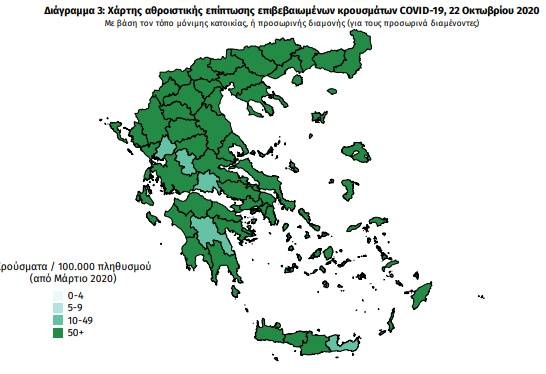Ο χάρτης αποτυπώνει τη γεωγραφική κατανομή των συνολικών κρουσμάτων COVID-19 (από την αρχή της επιδημίας) ανά Περιφερειακή Ενότητα της χώρας, με βάση την δηλωθείσα διεύθυνση μόνιμης κατοικίας του ασθενούς, ή τη διεύθυνση προσωρινής διαμονής για τους τουρίστες και άλλους προσωρινά διαμένοντες στην Ελλάδα.
