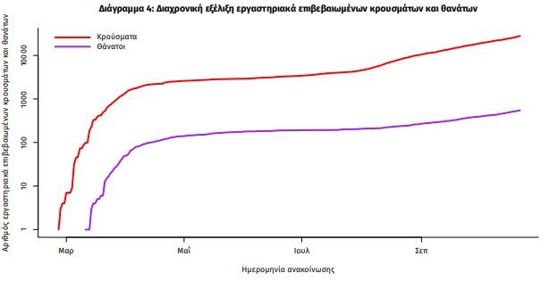 Η διαχρονική εξέλιξη των συνολικών κρουσμάτων και συνολικού αριθμού των θανάτων ασθενών COVID-19 παρουσιάζεται στο ακόλουθο διάγραμμα (σε λογαριθμική κλίμακα).