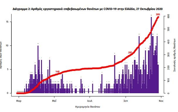 Τέλος, έχουμε 12 ακόμα καταγεγραμμένους θανάτους και 593 θανάτους συνολικά στη χώρα. 225 (37.9%) γυναίκες και οι υπόλοιποι άνδρες. Η διάμεση ηλικία των θανόντων συμπολιτών μας ήταν τα 79 έτη και το 96.1% είχε κάποιο υποκείμενο νόσημα ή/και ηλικία 70 ετών και άνω.