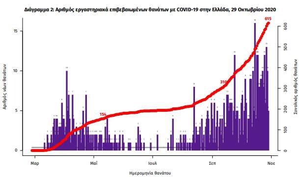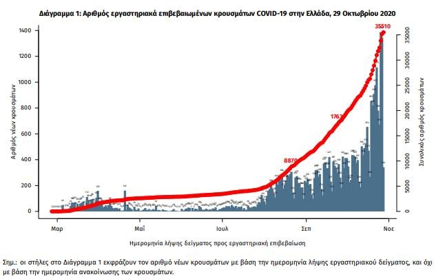 Τα νέα εργαστηριακά επιβεβαιωμένα κρούσματα της νόσου είναι 1211, εκ των οποίων 47 συνδέονται με γνωστές συρροές και 35 εντοπίστηκαν κατόπιν ελέγχων στις πύλες εισόδου της χώρας. Ο συνολικός αριθμός των κρουσμάτων ανέρχεται σε 35510 (ημερήσια μεταβολή +3.5%), εκ των οποίων 55.2% άνδρες. Οι νέοι θάνατοι ασθενών με COVID-19 είναι 12, ενώ από την έναρξη της επιδημίας έχουν καταγραφεί συνολικά 615 θάνατοι. Η διάμεση ηλικία των ασθενών που απεβίωσαν είναι 79 έτη. Ο αριθμός των ασθενών που νοσηλεύονται διασωληνωμένοι είναι 114 (70.2% άνδρες).