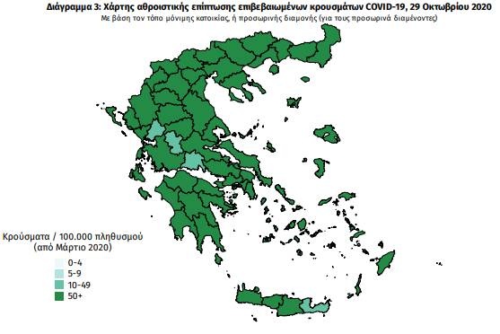Τα στοιχεία που παρουσιάζονται αφορούν περιστατικά από την επιδημιολογική επιτήρηση της νόσου από το νέο κορονοϊό (COVID19), με βάση τα δεδομένα που έχουν δηλωθεί στον ΕΟΔΥ και καταγραφεί μέχρι τις 29 Οκτωβρίου 2020 (ώρα 15:00).