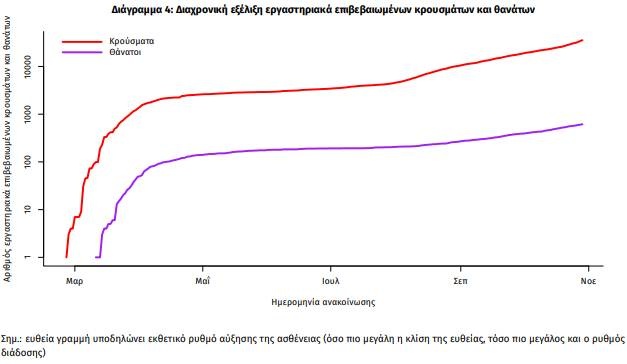 Η διαχρονική εξέλιξη των συνολικών κρουσμάτων και συνολικού αριθμού των θανάτων ασθενών COVID-19 παρουσιάζεται στο ακόλουθο διάγραμμα (σε λογαριθμική κλίμακα).