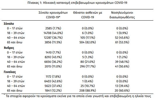 Η μέση ηλικία των κρουσμάτων είναι 38 έτη (εύρος 0 έως 103 ετών), ενώ η μέση ηλικία των θανάτων είναι 79 έτη (εύρος 25 έως 102 ετών). Η ηλικιακή κατανομή των (α) συνολικών κρουσμάτων, (β) των περιστατικών που κατέληξαν σε θάνατο και (γ) των ασθενών που νοσηλεύονται διασωληνωμένοι, είναι η ακόλουθη: