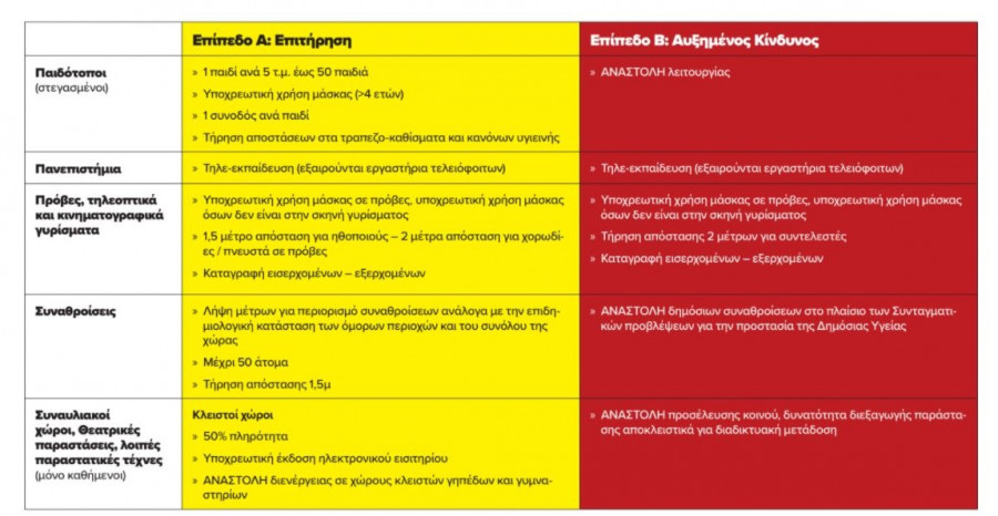 Συγκεκριμένα, σε ζώνη επιτήρησης Α εντάσσονται οι μέχρι πρότινος «πράσινες» και «κίτρινες» περιοχές και σε ζώνη αυξημένου κινδύνου Β εντάσσονται οι «πορτοκαλί» και οι «κόκκινες» περιοχές.