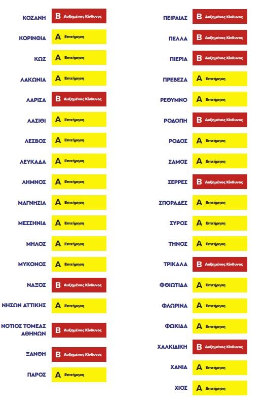 Στο επίπεδο Β’-Αυξημένου κινδύνου (κόκκινο) κατατάσσονται οι υπόλοιπες 27 Περιφερειακές Ενότητες: