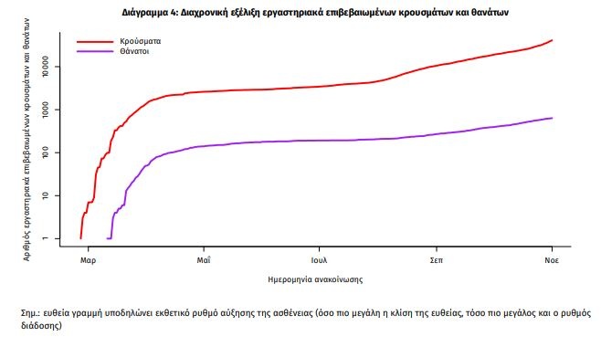 Η διαχρονική εξέλιξη των συνολικών κρουσμάτων και συνολικού αριθμού των θανάτων ασθενών COVID-19 παρουσιάζεται στο ακόλουθο διάγραμμα (σε λογαριθμική κλίμακα).