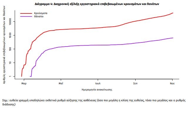 Η διαχρονική εξέλιξη των συνολικών κρουσμάτων και συνολικού αριθμού των θανάτων ασθενών COVID-19 παρουσιάζεται στο ακόλουθο διάγραμμα (σε λογαριθμική κλίμακα).