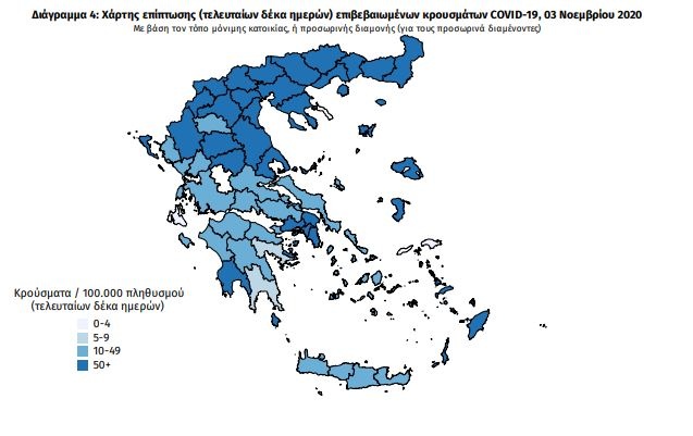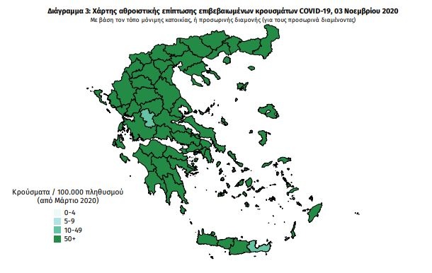 Ο χάρτης αποτυπώνει τη γεωγραφική κατανομή των συνολικών κρουσμάτων COVID-19 (από την αρχή της επιδημίας) ανά Περιφερειακή Ενότητα της χώρας, με βάση την δηλωθείσα διεύθυνση μόνιμης κατοικίας του ασθενούς, ή τη διεύθυνση προσωρινής διαμονής για τους τουρίστες και άλλους προσωρινά διαμένοντες στην Ελλάδα.