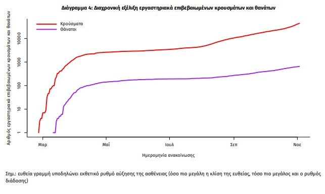 Η διαχρονική εξέλιξη των συνολικών κρουσμάτων και συνολικού αριθμού των θανάτων ασθενών COVID-19 παρουσιάζεται στο ακόλουθο διάγραμμα (σε λογαριθμική κλίμακα).