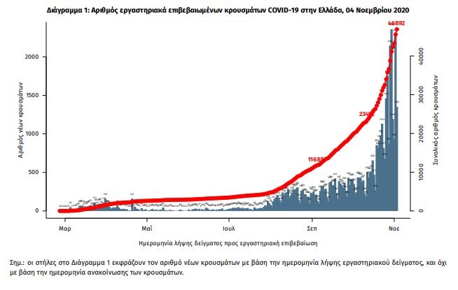 Τα νέα εργαστηριακά επιβεβαιωμένα κρούσματα της νόσου είναι 2.646, εκ των οποίων 42 εντοπίστηκαν κατόπιν ελέγχων στις πύλες εισόδου της χώρας. Ο συνολικός αριθμός των κρουσμάτων ανέρχεται σε 46.892 (ημερήσια μεταβολή +6.0%), εκ των οποίων 54.6% άνδρες.