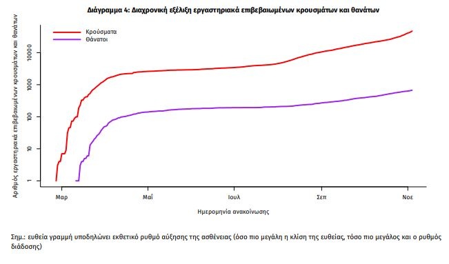 Η διαχρονική εξέλιξη των συνολικών κρουσμάτων και συνολικού αριθμού των θανάτων ασθενών COVID-19 παρουσιάζεται στο ακόλουθο διάγραμμα (σε λογαριθμική κλίμακα).