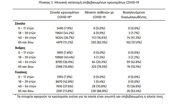 Η μέση ηλικία των κρουσμάτων είναι 38 έτη (εύρος 0 έως 103 ετών), ενώ η μέση ηλικία των θανάτων είναι 79 έτη (εύρος 25 έως 103 ετών). Η ηλικιακή κατανομή των (α) συνολικών κρουσμάτων, (β) των περιστατικών που κατέληξαν σε θάνατο και (γ) των ασθενών που νοσηλεύονται διασωληνωμένοι, είναι η ακόλουθη: