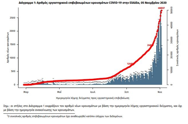 Τα νέα εργαστηριακά επιβεβαιωμένα κρούσματα της νόσου είναι 2.917, εκ των οποίων 27 εντοπίστηκαν κατόπιν ελέγχων στις πύλες εισόδου της χώρας. Ο συνολικός αριθμός των κρουσμάτων ανέρχεται σε 49.807 (ημερήσια μεταβολή +6.2%), εκ των οποίων