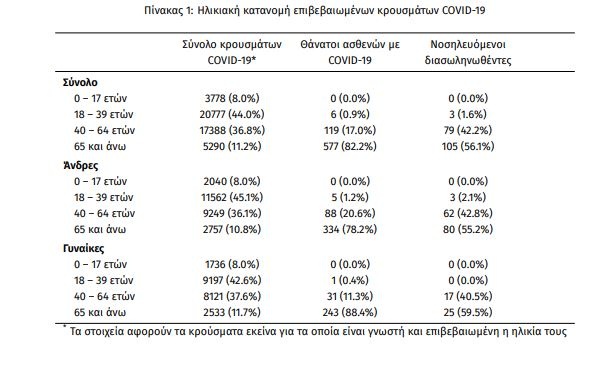 Η μέση ηλικία των κρουσμάτων είναι 38 έτη (εύρος 0 έως 103 ετών), ενώ η μέση ηλικία των θανάτων είναι 79 έτη (εύρος 25 έως 103 ετών). Η ηλικιακή κατανομή των (α) συνολικών κρουσμάτων, (β) των περιστατικών που κατέληξαν σε θάνατο και (γ) των ασθενών που νοσηλεύονται διασωληνωμένοι, είναι η ακόλουθη: