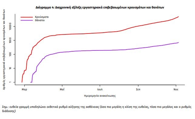 Η διαχρονική εξέλιξη των συνολικών κρουσμάτων και συνολικού αριθμού των θανάτων ασθενών COVID-19 παρουσιάζεται στο ακόλουθο διάγραμμα (σε λογαριθμική κλίμακα).