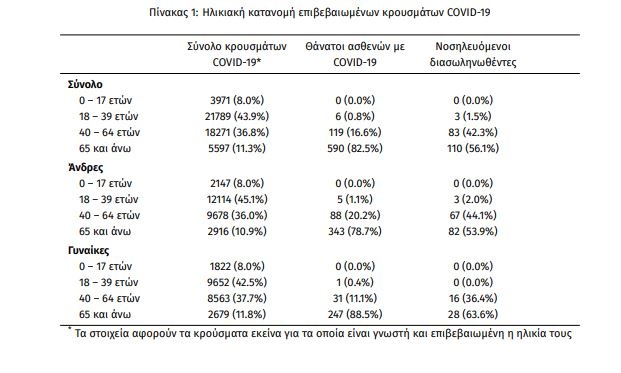 Η μέση ηλικία των κρουσμάτων είναι 38 έτη (εύρος 0 έως 103 ετών), ενώ η μέση ηλικία των θανάτων είναι 79 έτη (εύρος 25 έως 103 ετών). Η ηλικιακή κατανομή των (α) συνολικών κρουσμάτων, (β) των περιστατικών που κατέληξαν σε θάνατο και (γ) των ασθενών που νοσηλεύονται διασωληνωμένοι, είναι η ακόλουθη: