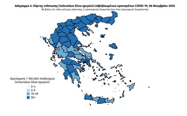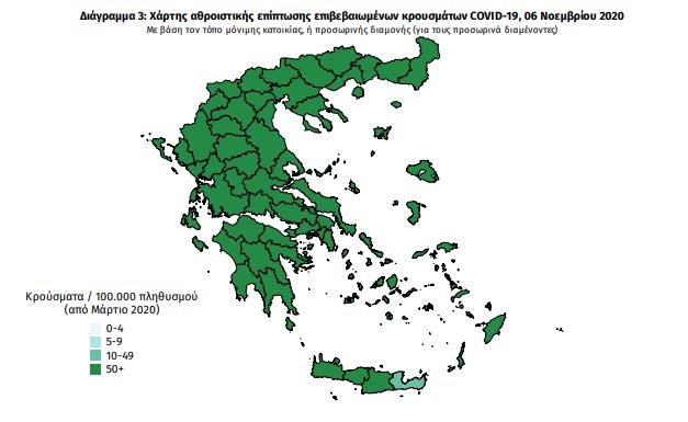 Ο χάρτης αποτυπώνει τη γεωγραφική κατανομή των συνολικών κρουσμάτων COVID-19 (από την αρχή της επιδημίας) ανά Περιφερειακή Ενότητα της χώρας, με βάση την δηλωθείσα διεύθυνση μόνιμης κατοικίας του ασθενούς, ή τη διεύθυνση προσωρινής διαμονής για τους τουρίστες και άλλους προσωρινά διαμένοντες στην Ελλάδα.