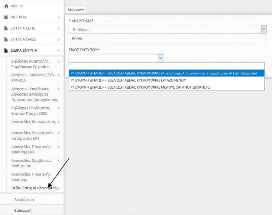 - Επιλογή: ΕΙΔΙΚΑ ΕΝΤΥΠΑ -> Βεβαιώσεις Κυκλοφορίας -> Εισαγωγή
