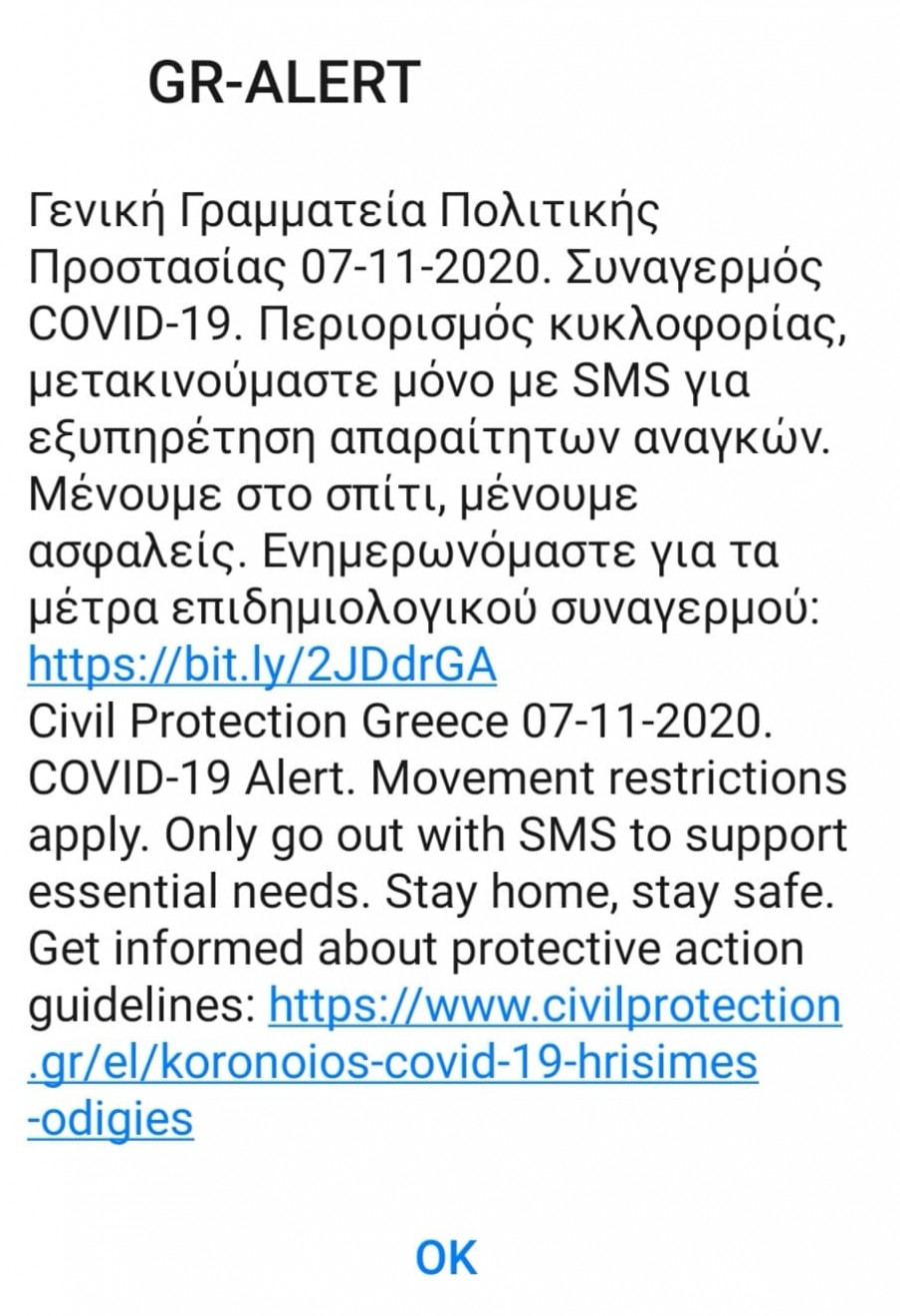 «Γενική Γραμματεία Πολιτικής Προστασίας 07-11-2020. Συναγερμός COVID-19. Περιορισμός κυκλοφορίας, μετακινούμαστε μόνο με SMS για εξυπηρέτηση απαραίτητων αναγκών. Μένουμε στο σπίτι, μένουμε ασφαλείας. Ενημερωνόμαστε για τα μέτρα επιδημιολογικού συναγερμού: https://bit.ly/2JDdrGA», αναφέρει το μήνυμα που πήγε στα κινητά των πολιτών σε όλη την επικράτεια, τόσο στα ελληνικά όσο και στα αγγλικά.