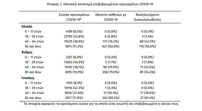 Η ηλικιακή κατανομή των (α) συνολικών κρουσμάτων, (β) των περιστατικών που κατέληξαν σε θάνατο και (γ) των ασθενών που νοσηλεύονται διασωληνωμένοι, είναι η ακόλουθη: