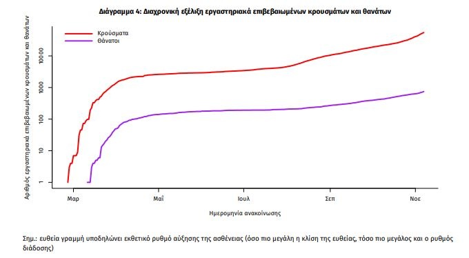 Η διαχρονική εξέλιξη των συνολικών κρουσμάτων και συνολικού αριθμού των θανάτων ασθενών COVID-19 παρουσιάζεται στο ακόλουθο διάγραμμα (σε λογαριθμική κλίμακα).