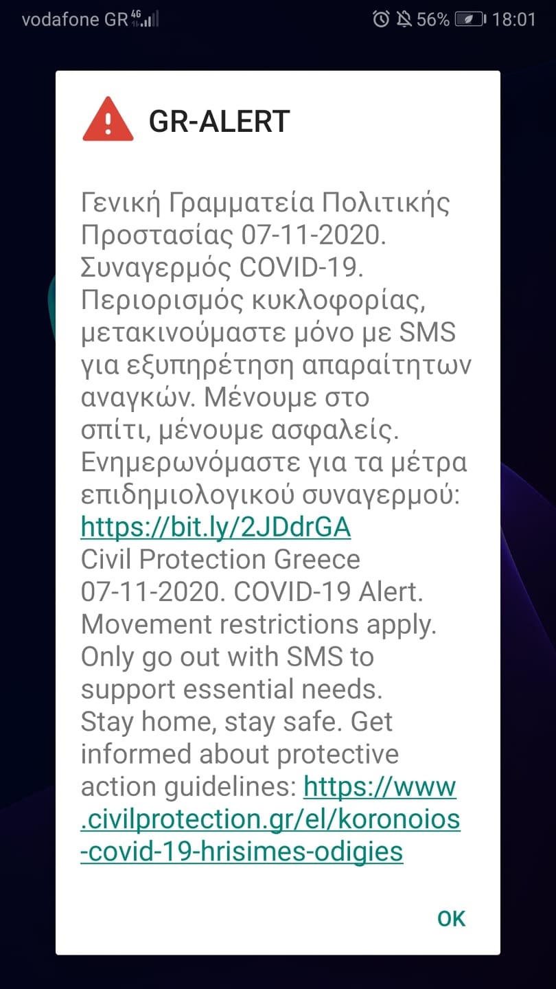 Μέσω του Αριθμού Έκτακτης Ανάγκης «112» έφτασε γύρω στις 6 το απόγευμα του Σαββάτου η ειδοποίηση από τη Γενική Γραμματεία Πολιτικής Προστασίας, για τις μετακινήσεις εν μέσω lockdown.