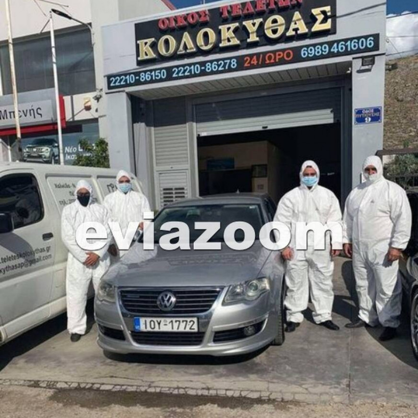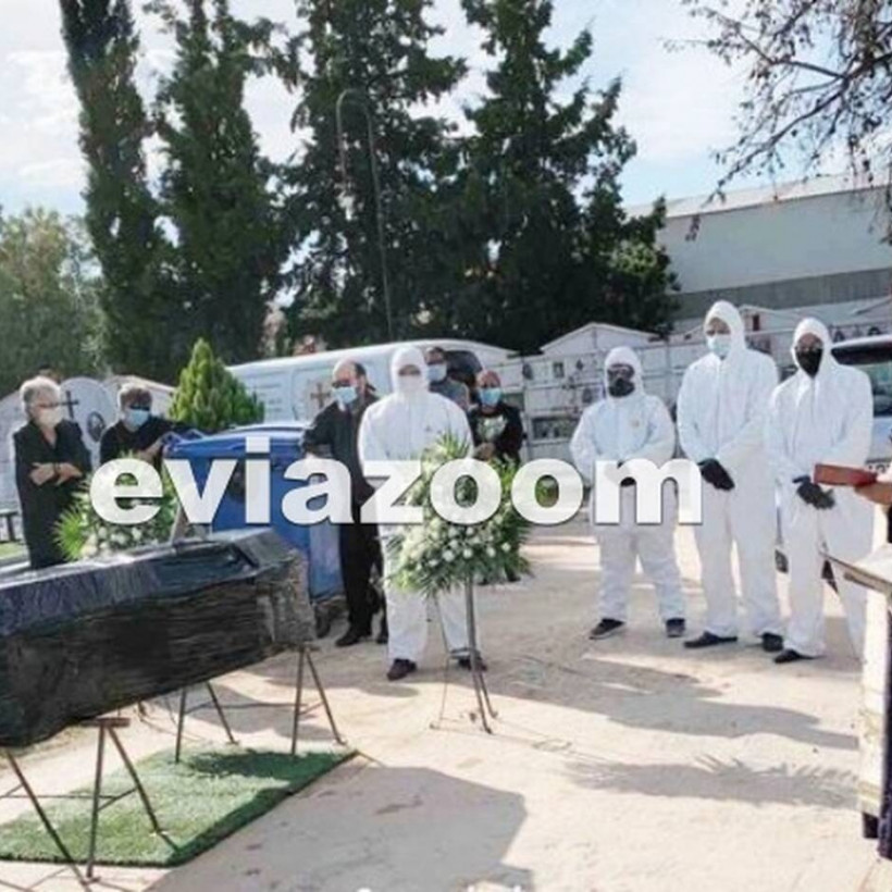 Οι εικόνες που δημοσίευσε η ιστοσελίδα Eviazoom.gr, είναι «γροθιά στο στομάχι». Το προσωπικό του γραφείου τελετών φορούσε ειδικές στολές κατά τη διάρκεια της κηδείας, από τη στιγμή που ο αποθανών «έφυγε» λόγω κορονοϊού.