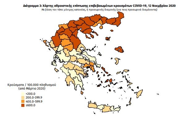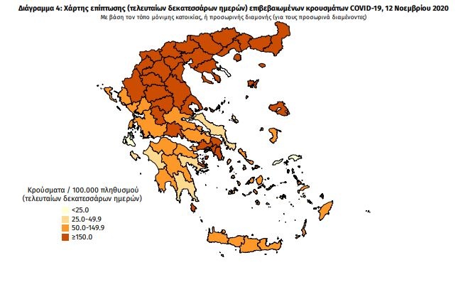 Ο χάρτης αποτυπώνει τη γεωγραφική κατανομή των συνολικών κρουσμάτων COVID-19 (από την αρχή της επιδημίας) ανά Περιφερειακή Ενότητα της χώρας, με βάση την δηλωθείσα διεύθυνση μόνιμης κατοικίας του ασθενούς, ή τη διεύθυνση προσωρινής διαμονής για τους τουρίστες και άλλους προσωρινά διαμένοντες στην Ελλάδα.