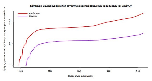 Η διαχρονική εξέλιξη των συνολικών κρουσμάτων και συνολικού αριθμού των θανάτων ασθενών COVID-19 παρουσιάζεται στο ακόλουθο διάγραμμα (σε λογαριθμική κλίμακα).