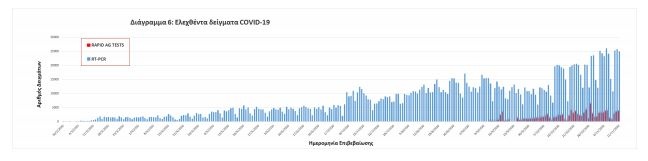 Από την 1η Ιανουαρίου 2020 μέχρι σήμερα, στα εργαστήρια που διενεργούν ελέγχους για τον νέο κορoνοϊό (SARS-CoV-2) και που δηλώνουν συστηματικά στον ΕΟΔΥ το σύνολο των δειγμάτων που ελέγχουν, έχουν συνολικά ελεγχθεί 2028196 κλινικά δείγματα ενώ από Μονάδες Υγείας και Κλιμάκια του ΕΟΔΥ που διενεργούν ελέγχους Rapid Ag έχουν ελεγχθεί 102369 δείγματα.