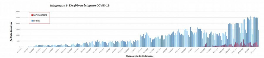 Δείγματα που έχουν ελεγχθεί: Από την 1η Ιανουαρίου 2020 μέχρι σήμερα, στα εργαστήρια που διενεργούν ελέγχους για τον νέο κορωνοϊό (SARS-CoV-2) και που δηλώνουν συστηματικά στον ΕΟΔΥ το σύνολο των δειγμάτων που ελέγχουν, έχουν συνολικά ελεγχθεί 2092324 κλινικά δείγματα ενώ από Μονάδες Υγείας και Κλιμάκια του ΕΟΔΥ που διενεργούν ελέγχους Rapid Ag έχουν ελεγχθεί 112416 δείγματα.