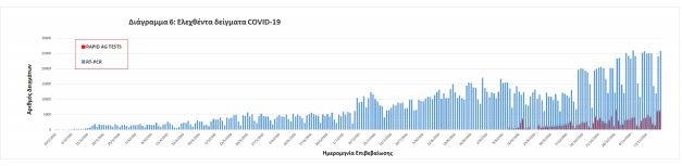 Από την 1η Ιανουαρίου 2020 μέχρι σήμερα, στα εργαστήρια που διενεργούν ελέγχους για τον νέο κορoνοϊό (SARS-CoV-2) και που δηλώνουν συστηματικά στον ΕΟΔΥ το σύνολο των δειγμάτων που ελέγχουν, έχουν συνολικά ελεγχθεί 2.153.954 κλινικά δείγματα ενώ από Μονάδες Υγείας και Κλιμάκια του ΕΟΔΥ που διενεργούν ελέγχους Rapid Ag έχουν ελεγχθεί 125.509 δείγματα.