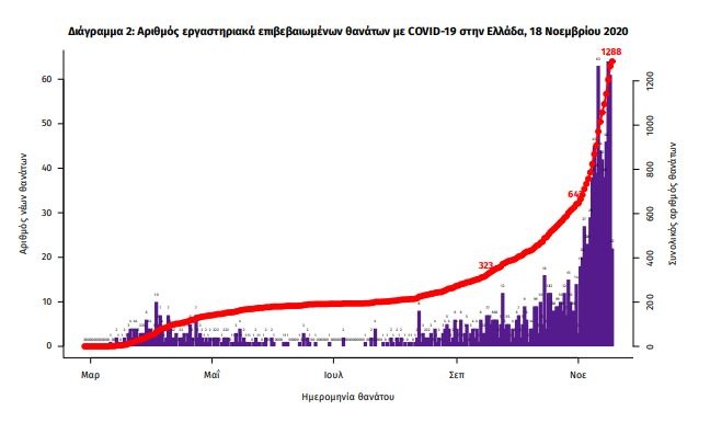 Τέλος, έχουμε 60 ακόμα καταγεγραμμένους θανάτους και 1.288 θανάτους συνολικά στη χώρα. Οι 523 (40,6%) γυναίκες και οι υπόλοιποι άνδρες. Η διάμεση ηλικία των θανόντων συμπολιτών μας ήταν τα 80 έτη και το 97,4% είχε κάποιο υποκείμενο νόσημα ή/και ηλικία 70 ετών και άνω.