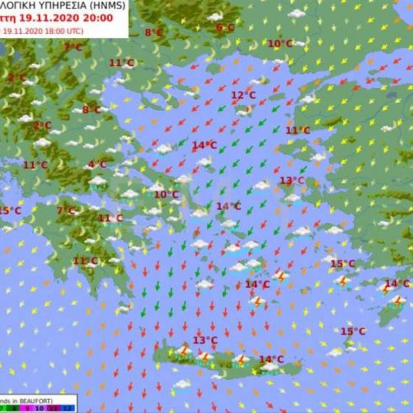 Άνεμοι: Από βόρειες διευθύνσεις 6 με 7 μποφόρ και στην περιοχή της Ρόδου και του Καστελλόριζου ανατολικοί νοτιοανατολικοί 5 με 6 μποφόρ.