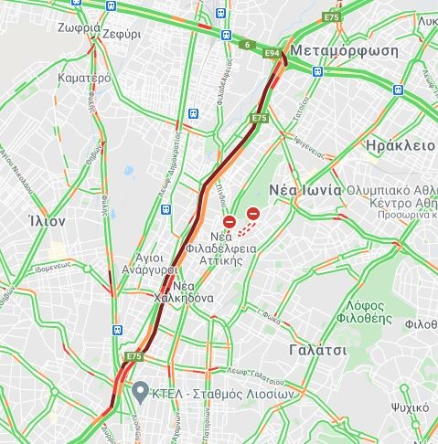 Στο ύψος της Φιλαδέλφειας, στην αριστερή λωρίδα, δύο οχήματα έχουν συγκρουστεί με το ένα να έχει αλλάξει κατεύθυνση από τη σύγκρουση και να «κοιτά» προς το αντίθετο ρεύμα.
