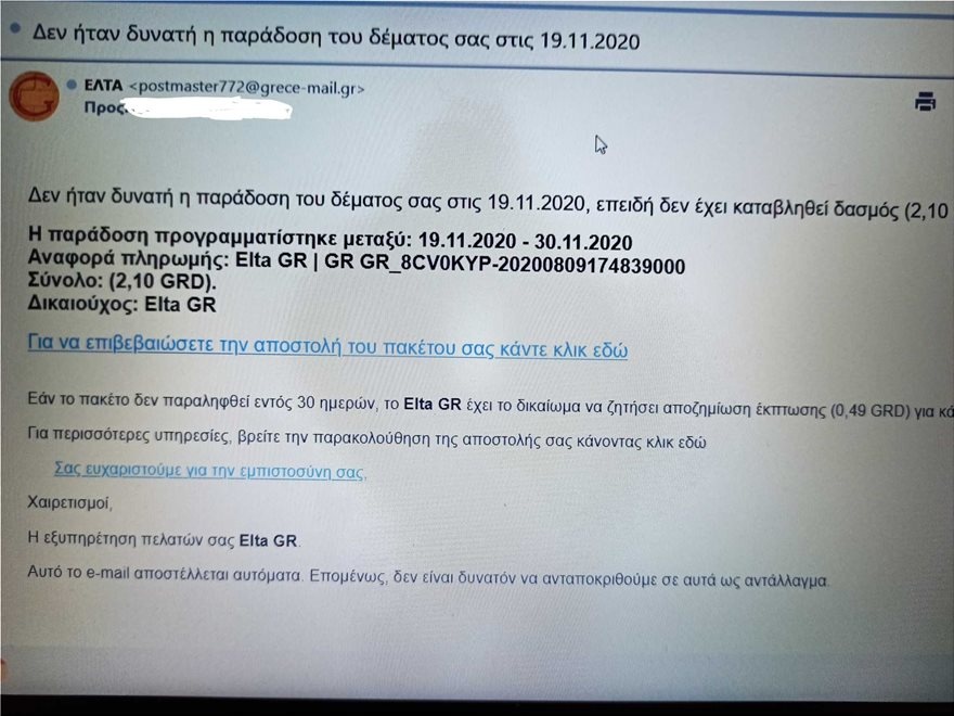 Ένα email με τα ΕΛΤΑ να είναι ο υποθετικός αποστολέας και αντικείμενο την παράδοση δέματος, έλαβαν αρκετοι διαδικτυακοί χρήστες. Σε αυτό, αναφέρεται ότι δεν είναι δυνατή η παράδοση του δέματος επειδή δεν έχει καταβληθεί δασμός €2,10, ενώ υπάρχει και εσωτερικός σύνδεσμος (link), που καλείται ο χρήστης να πατήσει, ώστε να πληρώσει το μικρό αυτό ποσό.