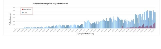 Από την 1η Ιανουαρίου 2020 μέχρι σήμερα, στα εργαστήρια που διενεργούν ελέγχους για τον νέο κορoνοϊό (SARS-CoV-2) και που δηλώνουν συστηματικά στον ΕΟΔΥ το σύνολο των δειγμάτων που ελέγχουν, έχουν συνολικά ελεγχθεί 2200427 κλινικά δείγματα ενώ από Μονάδες Υγείας και Κλιμάκια του ΕΟΔΥ που διενεργούν ελέγχους Rapid Ag έχουν ελεγχθεί 141237 δείγματα.