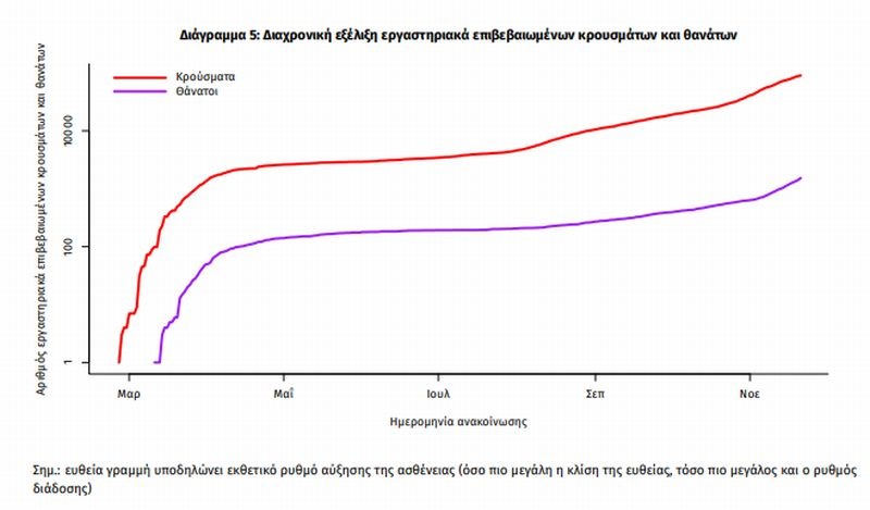 Η διαχρονική εξέλιξη των συνολικών κρουσμάτων και συνολικού αριθμού των θανάτων ασθενών COVID-19 παρουσιάζεται στο ακόλουθο διάγραμμα (σε λογαριθμική κλίμακα).