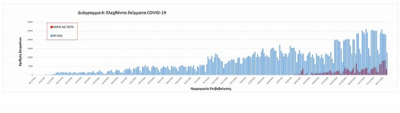 Από την 1η Ιανουαρίου 2020 μέχρι σήμερα, στα εργαστήρια που διενεργούν ελέγχους για τον νέο κορoνοϊό (SARS-CoV-2) και που δηλώνουν συστηματικά στον ΕΟΔΥ το σύνολο των δειγμάτων που ελέγχουν, έχουν συνολικά ελεγχθεί 2200427 κλινικά δείγματα ενώ από Μονάδες Υγείας και Κλιμάκια του ΕΟΔΥ που διενεργούν ελέγχους Rapid Ag έχουν ελεγχθεί 141237 δείγματα.