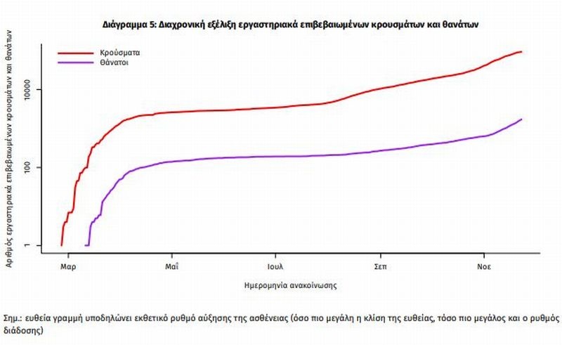 Η διαχρονική εξέλιξη των συνολικών κρουσμάτων και συνολικού αριθμού των θανάτων ασθενών COVID-19 παρουσιάζεται στο ακόλουθο διάγραμμα (σε λογαριθμική κλίμακα).