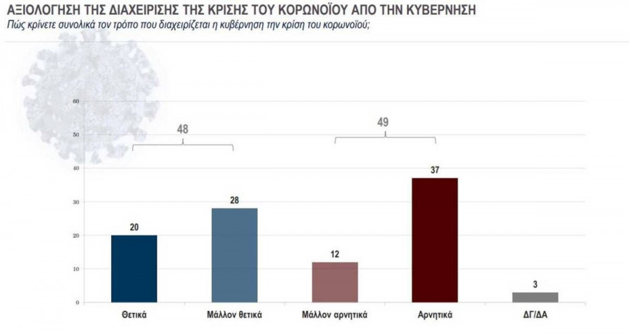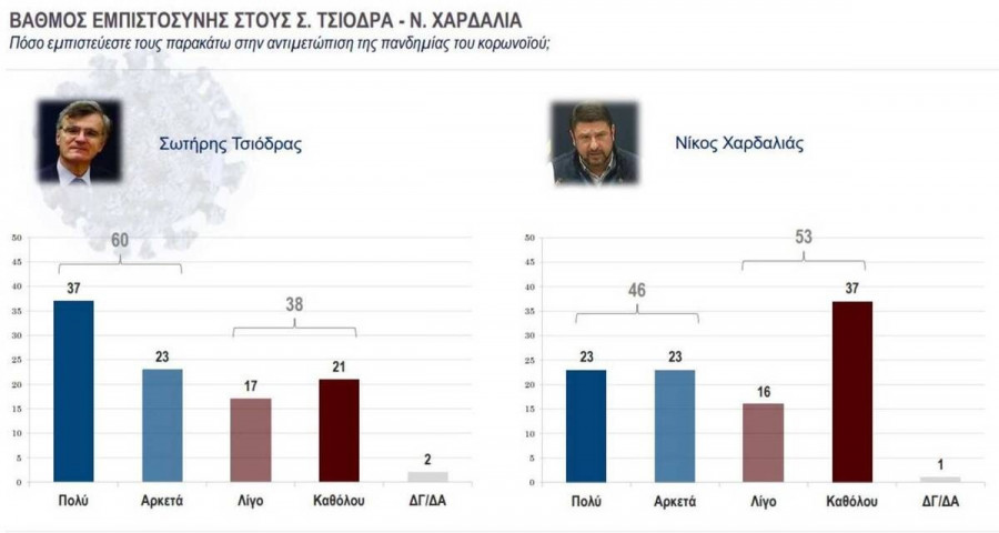 Στο ίδιο το μέτωπο της διαχείρισης της πανδημίας, παρά την ένταση του δεύτερου κύματος και τις ευθύνες που η κοινωνία τής επιρρίπτει, η κυβέρνηση διατηρεί τη θετική αξιολόγηση στα επίπεδα του 48%, σημειώνοντας στατιστικά μη σημαντική κάμψη 2 ποσοστιαίων μονάδων από τον Σεπτέμβριο. Παράλληλα, οι βασικοί διαχειριστές της κρίσης, Σωτήρης Τσιόδρας και Νίκος Χαρδαλιάς, συγκεντρώνουν υψηλά – δεδομένης της μεγάλης χρονικής διάρκειας της κρίσης – επίπεδα εμπιστοσύνης (60% και 46% αντίστοιχα).