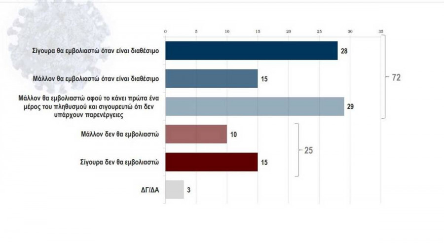Με αντίστοιχο τρόπο επιδρούν οι θετικές εξελίξεις και στο μέτωπο του εμβολίου κατά του κορονοϊού: σε σύγκριση με την τελευταία μέτρηση του Σεπτεμβρίου, μειώνονται σημαντικά κατά 10 μονάδες – στο 25% – οι λεγόμενοι «αρνητές» του εμβολιασμού, με το 75% των πολιτών να δηλώνει σήμερα πως προτίθεται – έστω και υπό προϋποθέσεις – να κάνει το εμβόλιο όταν αυτό είναι διαθέσιμο.