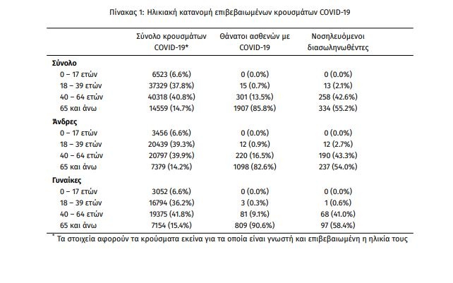 Τέλος, έχουμε 121 ακόμα καταγεγραμμένους θανάτους και 2.223 θανάτους συνολικά στη χώρα. 891 (40.1%) γυναίκες και οι υπόλοιποι άνδρες. Η διάμεση ηλικία των θανόντων συμπολιτών μας ήταν τα 80 έτη και το 96.8% είχε κάποιο υποκείμενο νόσημα ή/και ηλικία 70 ετών και άνω.