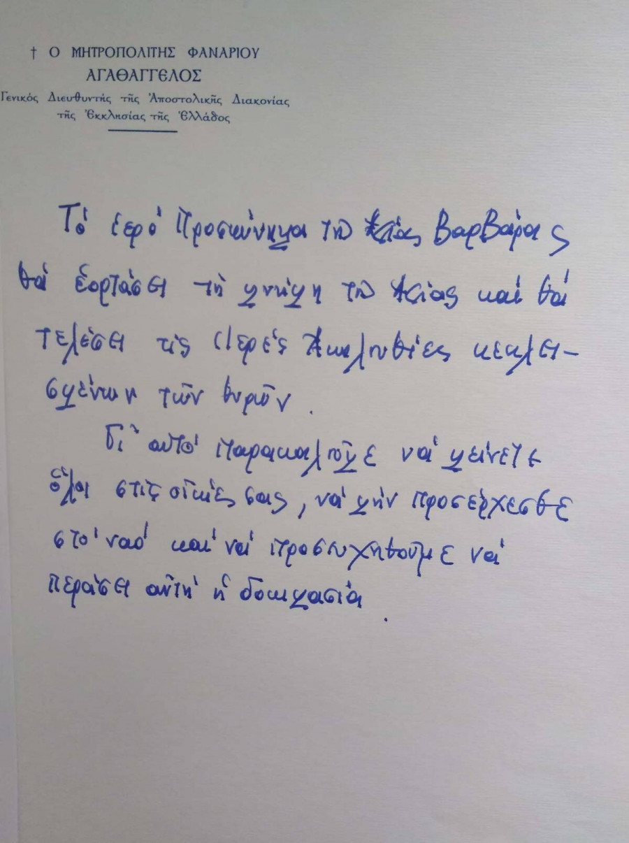 Από την πλευρά του ο κ. Μίχος παρέδωσε στον υπουργό Προστασίας του Πολίτη χειρόγραφη επιστολή του Μητροπολίτη Φαναρίου, Αγαθάγγελου, στην οποία αναφέρεται πως οι Ιερές Ακολουθίες θα πραγματοποιηθούν κεκλεισμένων των θυρών και με την οποία καλεί τους πιστούς να εορτάσουν στις οικίες τους και να μην προσέρχονται στον Ιερό Ναό.