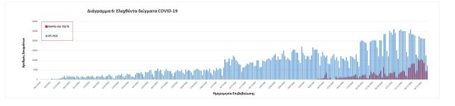 Από την 1η Ιανουαρίου 2020 μέχρι σήμερα, στα εργαστήρια που διενεργούν ελέγχους για τον νέο κορoνοϊό (SARS-CoV-2) και που δηλώνουν συστηματικά στον ΕΟΔΥ το σύνολο των δειγμάτων που ελέγχουν, έχουν συνολικά ελεγχθεί 2.373.566 κλινικά δείγματα ενώ από Μονάδες Υγείας και Κλιμάκια του ΕΟΔΥ που διενεργούν ελέγχους Rapid Ag έχουν ελεγχθεί 213.194 δείγματα.