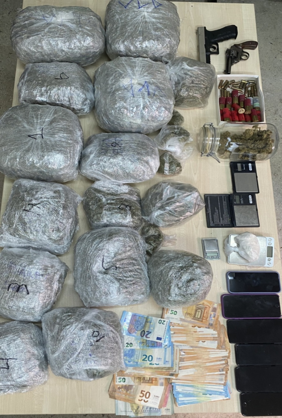 Από τις έρευνες που πραγματοποιήθηκαν, με τη συνδρομή αστυνομικών Ομάδων Πρόληψης και Καταστολής Εγκληματικότητας (Ο.Π.Κ.Ε.), στις οικίες των μελών της οργάνωσης, συνολικά βρέθηκαν και κατασχέθηκαν: περισσότερα από 10 κιλά κάνναβη, 172 γραμμάρια κοκαΐνη, 7 ζυγαριές ακριβείας, περίστροφο και πιστόλι κρότου, 39.060 ευρώ, 5 οχήματα, 6 μοτοσικλέτες και 36 κινητά τηλέφωνα.