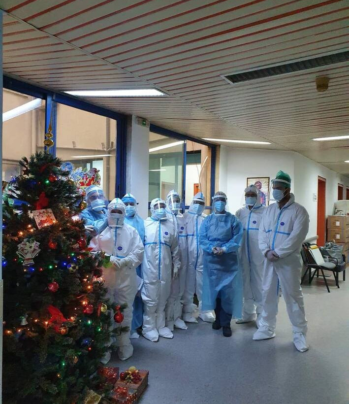 «Οι εργαζόμενοι ιατροί και νοσηλευτές της Α"Παθολογικής/ covid19 στο Ιπποκράτειο Θεσσαλονίκης βρήκαν το κουράγιο και τη διάθεση να στολίσουν το χριστουγεννιάτικο δένδρο και να ευχηθούν σε ασθενείς και συνεργάτες ''Καλά Χριστούγεννα''. Χθες ήταν η πρώτη εφημερία που μετά από πολύ καιρό πήγε καλύτερα με λιγότερα περιστατικά και μας γέμισε αισιοδοξία !!!»
