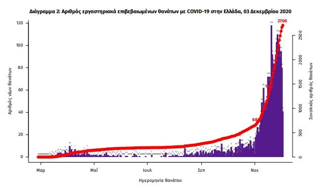 Τέλος, καταγράφηκαν 100 νέοι θάνατοι τις τελευταίες 24 ώρες, με τον συνολικό αριθμό των νεκρών να ανέρχονται στους 2.706. Από τους νεκρούς, οι 1.085 (40,1%) γυναίκες και οι υπόλοιποι άνδρες. Η διάμεση ηλικία των θανόντων συμπολιτών μας ήταν τα 80 έτη και το 96,5% είχε κάποιο υποκείμενο νόσημα ή/και ηλικία 70 ετών και άνω.