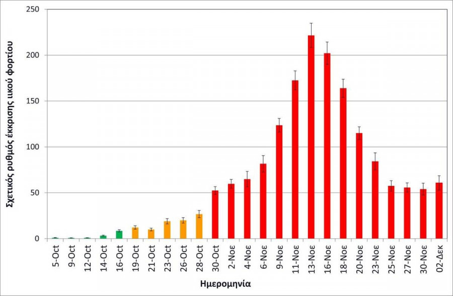 Στον συνημμένο διάγραμμα, που δημοσιεύει το ΑΠΕ-ΜΠΕ, οι ημέρες των δειγματοληψιών, που καταγράφονται με κόκκινο χρώμα αντιστοιχούν σε περισσότερα από 500 κρούσματα - όπως ανακοινώθηκαν τις αντίστοιχες ημέρες από τον ΕΟΔΥ - οι μέρες που καταγράφονται με πορτοκαλί σε 100-400 κρούσματα και οι μέρες που καταγράφονται με πράσινο σε λιγότερα από εκατό κρούσματα.