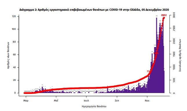Τέλος, έχουμε 98 ακόμα καταγεγραμμένους θανάτους και 2.902 θανάτους συνολικά στη χώρα. 1156 (39.8%) γυναίκες και οι υπόλοιποι άνδρες. Η διάμεση ηλικία των θανόντων συμπολιτών μας ήταν τα 79 έτη και το 96.1% είχε κάποιο υποκείμενο νόσημα ή/και ηλικία 70 ετών και άνω.